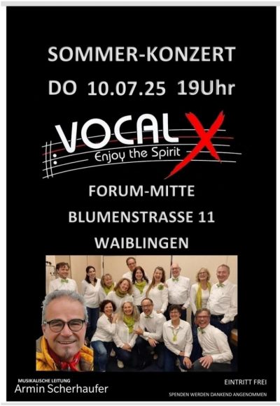 Weihnachtsmarkt WaiblingenWie im vergangenen Jahr bietet Vocal-X eine stimmungsvolle Auswahl von groovigen Weihnachtsliedern. ENJOY THE SPIRIT!